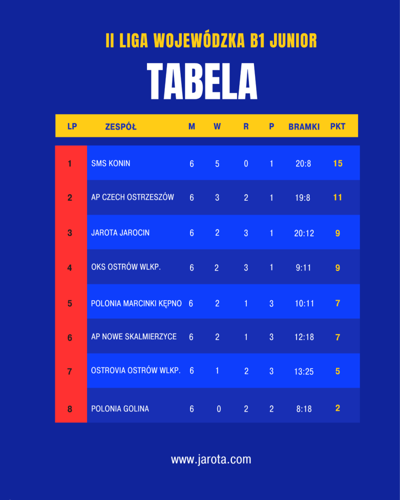 Aktualna tabela II Ligi Wojewódzkiej B1 Junior w sezonie 2025/26: